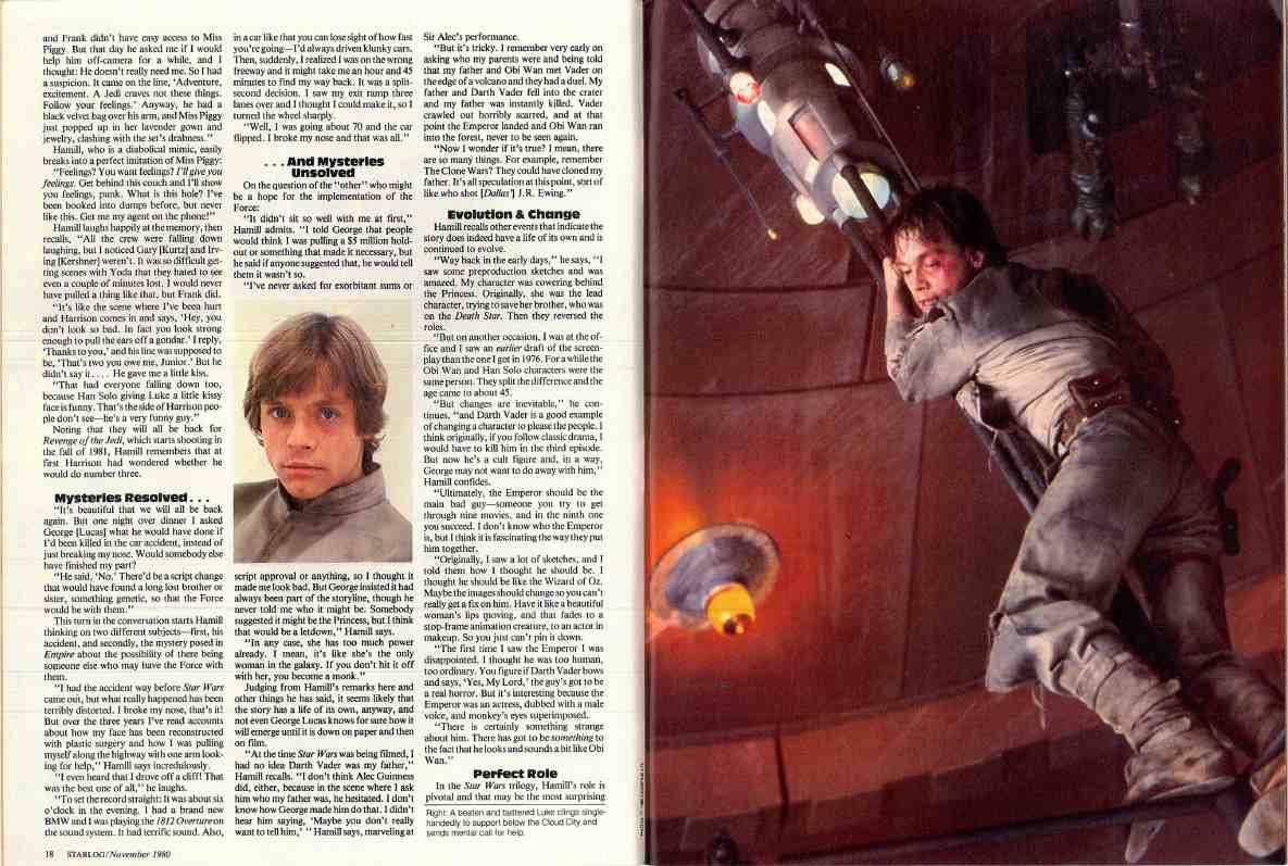 “It’s like the scene where I’ve been hurt and Harrison comes in and says, ‘Hey, you don’t look so bad to me. In fact you look strong enough to pull the ears off a gundark.’ I reply, ‘Thanks to you,’ and his line was supposed to be, ‘That’s two you owe me, junior.’ But he didn’t say it… he gave me a little kiss.”